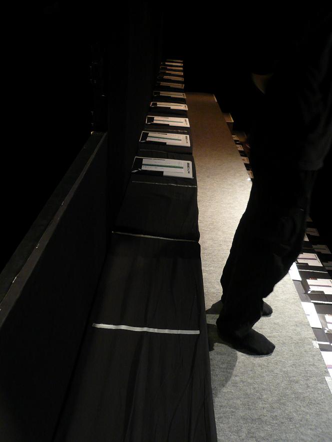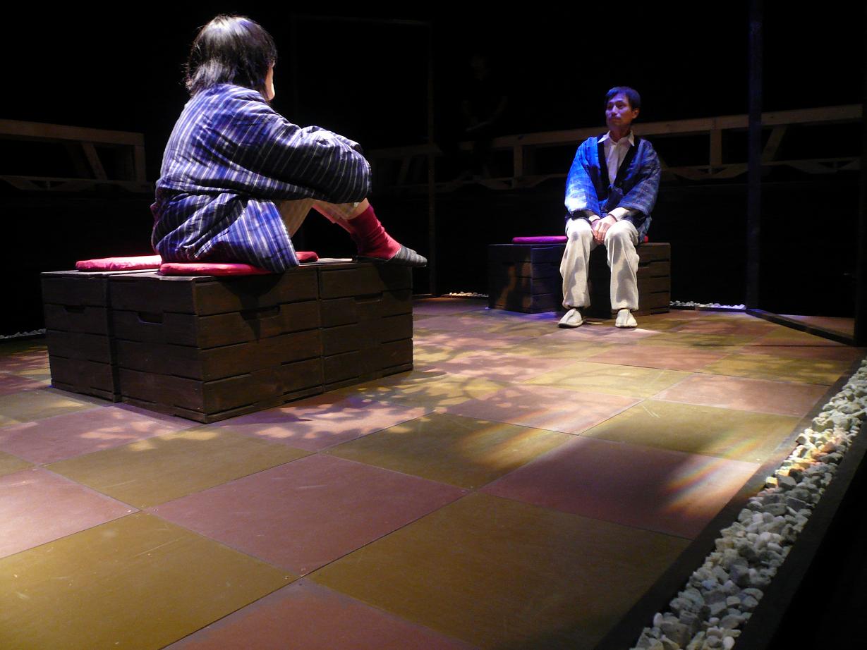 我々のがんばりをこえるなにかがときどき劇場の天井からのぞいている気がする。確かに天井近くには木の柱がワイヤーからぶら下がっていて、そこになにかがひそめる余地はありそうだけれど。