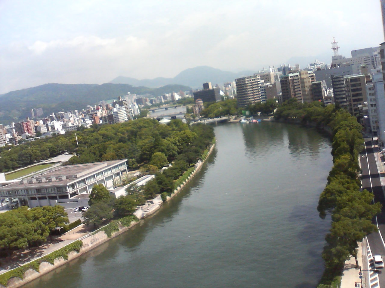 平和祈念公園。川。そして、よくよく見ると、川の先のほうに、原爆ドームが小さく建っています。この写真にもう写っています。ということは。